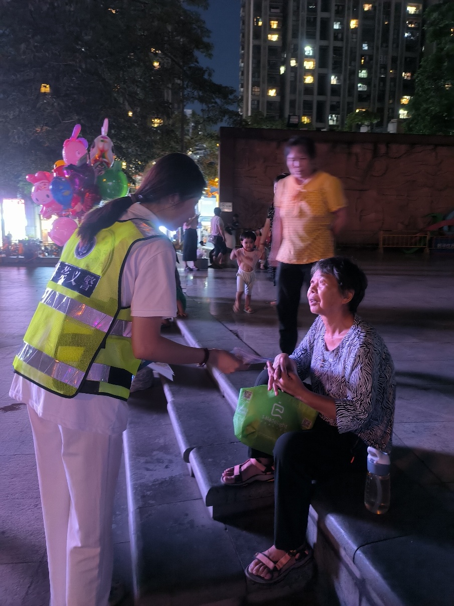 杨嘉谊同学为社区居民发放防诈骗宣传(左一)