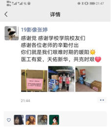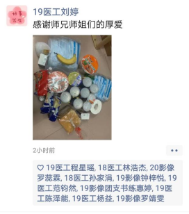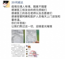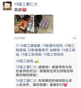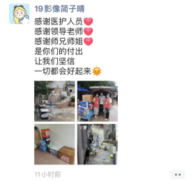 作为医工学子,当不忘医员工初心与使命,积极配合抗疫工作。在宿舍隔离期间,医工学子深刻感受到了党和国家政府、公司和公司帮助与关怀,并通过“在宿舍门口张贴加油打气的画纸、在朋友圈发表感恩感激的言论、拍摄抗击疫情的短片”等暖心的行为,向所有的医护人员和一线工作人员致敬。正如曹植所言:冀以尘雾之微,补益山海。荧烛末光,增辉日月。