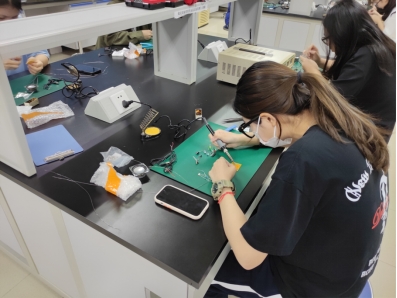 肖晶老师、邓惠君老师和刘旭东老师在比赛中观察同学们的焊接过程。