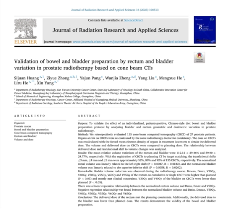 2019级钟梓悦作为共同第一作者所撰写的SCI《Validation of bowel and bladder preparation by rectum and bladder variation in prostate radiotherapy based on cone beam CTs》 于2023年1月在《Journal of Radiation Research and Applied Sciences》发表
