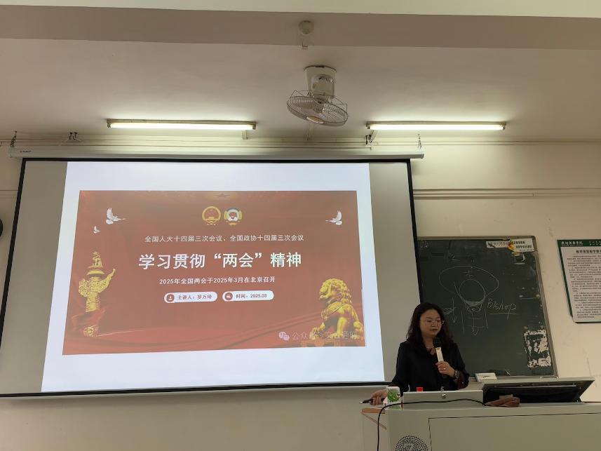 副书记罗万玲围绕两会热门议题与同学们互动,深入且全面地剖析全国两会精神,引导同学们深刻把握两会精神的核心要义,持续强化思想定力,明晰应将党中央的战略部署切实转化为自身工作、学习的实际指引。并借助当下热门的 AI 人工智能技术、新能源汽车等助力高质量发展的鲜活案例进行讲解。以此启发同学们在各自的专业领域探索创新,鼓励大家找准自身定位,深度融合专业学习与国家需求。此外,罗书记着重指出,“两会” 精神高度强调创新是推动发展的第一动力,这一理念贯穿于各个领域,她鼓励同学们尝试运用新的视角去看待问题、解决问题。课程尾声,副书记罗万玲老师强调今天的学习只是一个开始,希望同学们能够把“两会”精神融入到自己的学习和生活中。